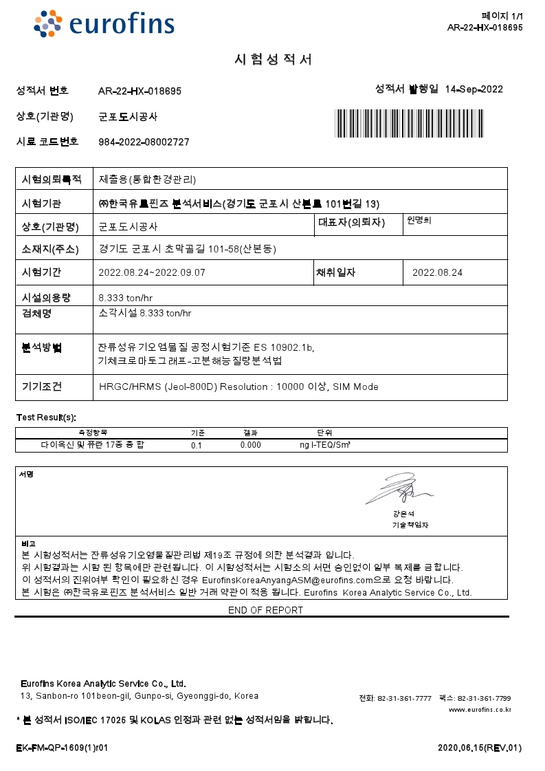 군포환경관리소 2022년 3/4분기 법적 다이옥신 측정결과 작성자 환경관리운영팀 등록일자 2022년 10월 6일 17시 42분 40초 조회 323 2022년 3/4분기 법적 다이옥신 측정 결과에 대해 알려드립니다. ■ 측정일시: 2022년 8월 24일(수) 10시 00분 ~ 16시 00분■ 측정장소: 군포환경관리소 굴뚝(연돌)■ 측정기관: 한국유로핀즈 분석서비스 ■ 측정결과 구분허가배출기준측정결과굴뚝0.1ng-TEQ/Sm30.000 굴뚝 배출가스 다이옥신 성적서(2022년 3분기).jpg [ Size : 290.68KB , Down : 168 ] 미리보기 다운로드 목록보기