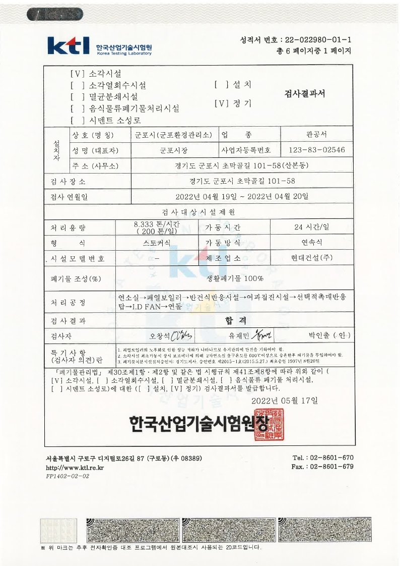 군포환경관리소 2022년 소각로 정기(성능)검사 성적서 작성자 환경관리운영팀 등록일자 2022년 6월 2일 14시 59분 57초 조회 293 2022년 소각로 정기(성능)검사 결과에 대해 알려드립니다.■ 검사일시: 2022년 4월 19일~4월 20일■ 검사장소: 군포환경관리소 소각로(200톤/일)■ 검사기관: 한국산업기술시험원 ■ 검사결과: 합격 군포환경관리소 2022년 소각시설 정기(성능)검사 결과서.jpg [ Size : 473.49KB , Down : 95 ] 미리보기 다운로드 목록보기