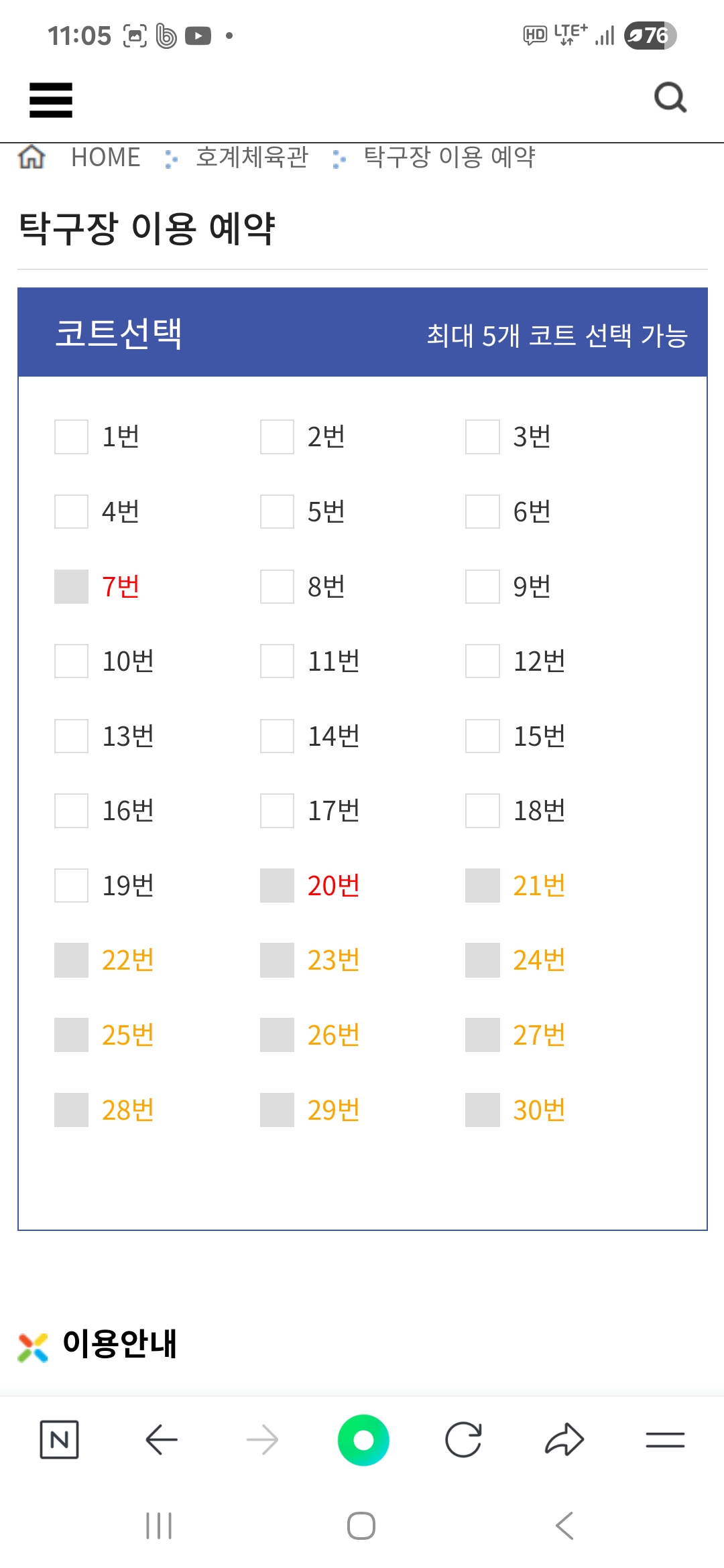 안녕하세요. 대관 추첨제 관련 신청 방법 개선해 주시기 바랍니다. 1시간 단위로 한개씩 밖에 안됩니다. 동호회에서 신청할려면 너무 많은 회수의 신청을 해야 합니다. 여러개의 날짜 동시 선택 여러개의 테이블 동시 선택 시간 1시간.2시간.3시간 동시 선택하게 주시기 바랍니다. 멀티 시간대 설정하고 1개월 날짜 멀티로 선택하게 해 주세요 참조로 추첨제는아니지만 호계체육관은 같은 시간대 여러테이블을 신청할 수 있습니다. 보통 시민체육관의 경우 주말 대관이 문제인데 동호회에서는 2~3시간 3~5개 테이블을 사용합니다. 고려하여 추첨제 대과 신청을 쉽게 할 수 있도록 요청합니다