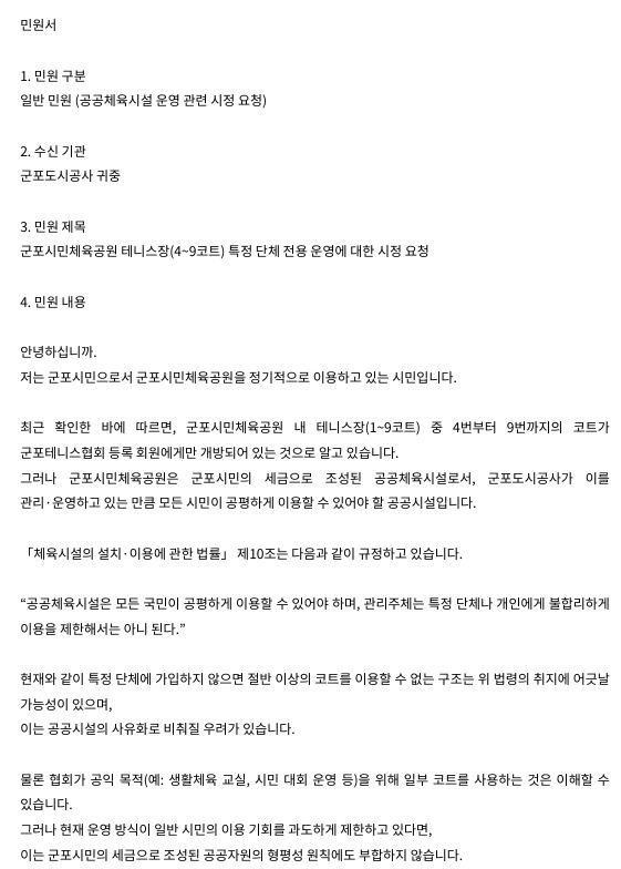 최근 확인한 바에 따르면, 군포시민체육공원 내 테니스장(1~9코트) 중 4번부터 9번까지의 코트가 군포테니스협회 등록 회원에게만 개방되어 있는 것으로 알고 있습니다. 군포테니스협회에 들어 갈려고하면 회비,인원수 제약이 있고 코트 사용료 + 회비까지 낸다고 하는건 이중 비용지불로 생각됩니다 산본시민 누구나 공평하게 사용할수 있게 군포 도시공사에서 조율이 필요할거같습니다 군포도시공사(시민체육시설팀) 담당,팀장님께 문의드렸을땐 군포테니스협회에서 정하는건 어쩔수 없다 라고 말씀하셨는데 군포도시공사는 군포 시민공원(테니스장) 의 행정적 관리·운영 주체 입니다 이에 군포시 테니스 협의 가입에 따른 공식적인 입장 답변 부탁드립니다 ※군포시민체육공원은 시민 모두의 공공재입니다. 단체의 전용물이 되지 않도록 공정하고 합리적인 운영을 요청드립니다※