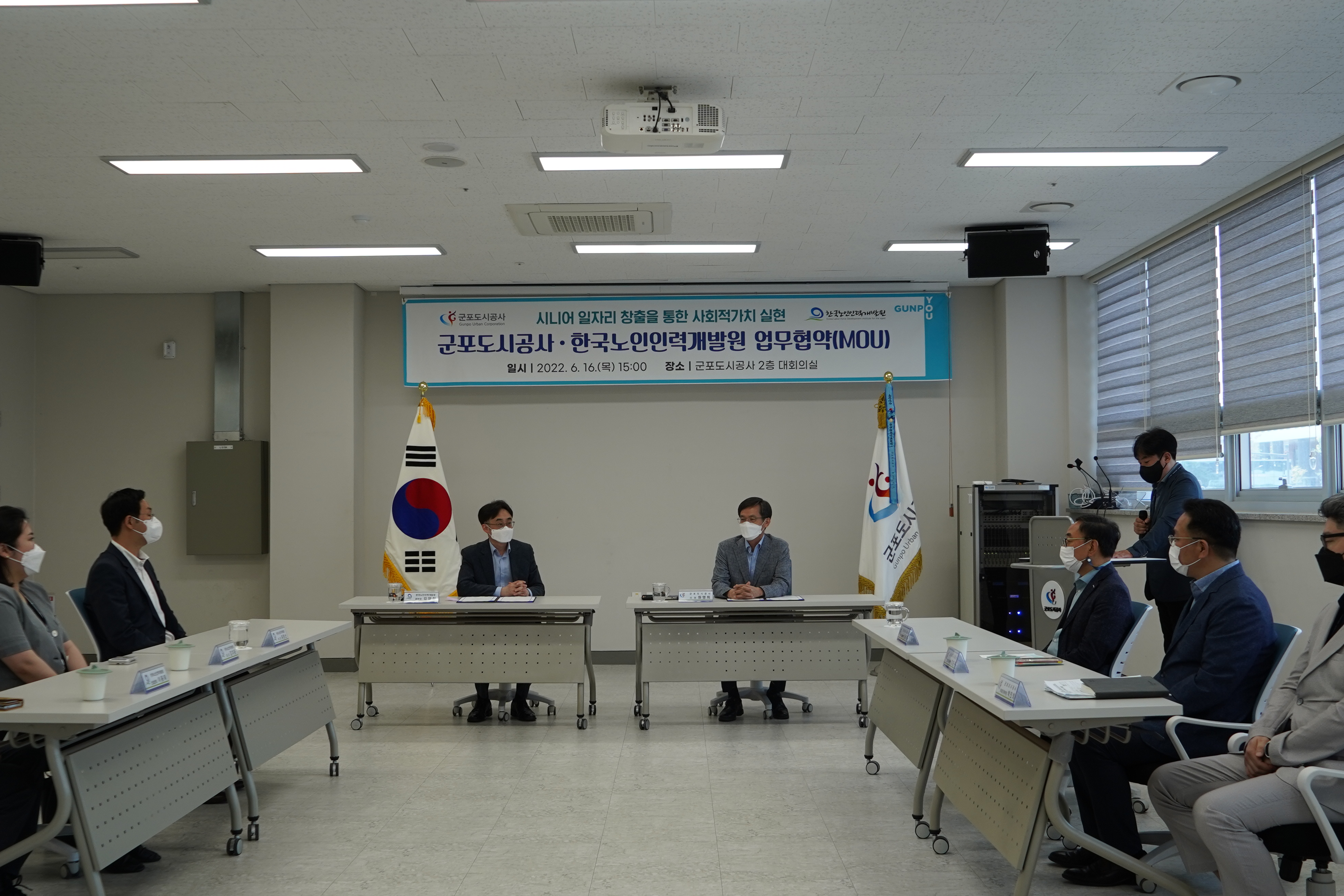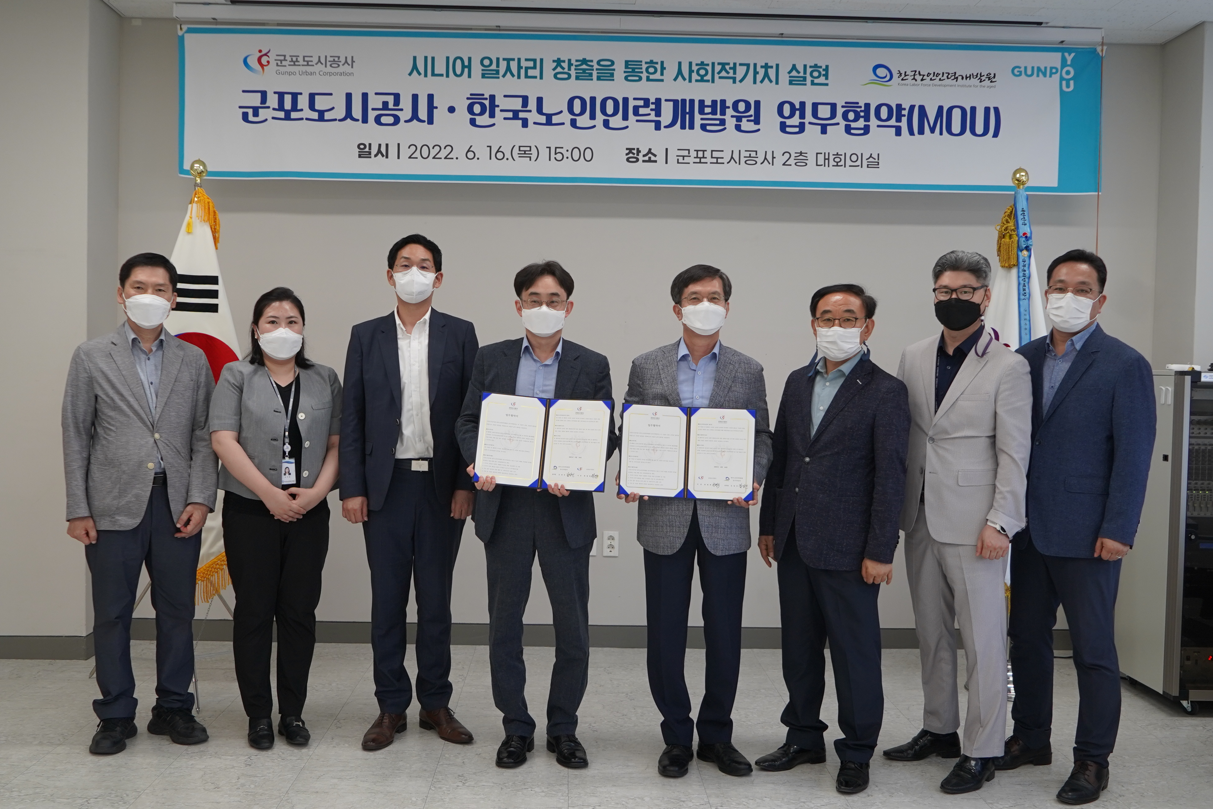 2022-06-16 군포도시공사-한국노인인력개발원 업무협약 체결 작성자 CS담당자 등록일자 2022년 6월 16일 17시 27분 1초 조회 380 2022년 6월 16일군포도시공사-한국노인인력개발원 업무협약 체결군포도시공사는 시니어 일자리 창출을 위해 한국노인인력개발원과 업무협약을 체결했습니다!한국노인인력개발원의 ‘시니어 인턴십 사업’에 참여하는 등 시니어 일자리 창출에 앞장설 예정입니다 :) 사진1.JPG [ Size : 2.76MB , Down : 83 ] 미리보기 다운로드 사진2.JPG [ Size : 2.91MB , Down : 84 ] 미리보기 다운로드 사진3.JPG [ Size : 2.37MB , Down : 81 ] 미리보기 다운로드 사진4.JPG [ Size : 2.68MB , Down : 90 ] 미리보기 다운로드 사진5.JPG [ Size : 3.06MB , Down : 85 ] 미리보기 다운로드 목록보기