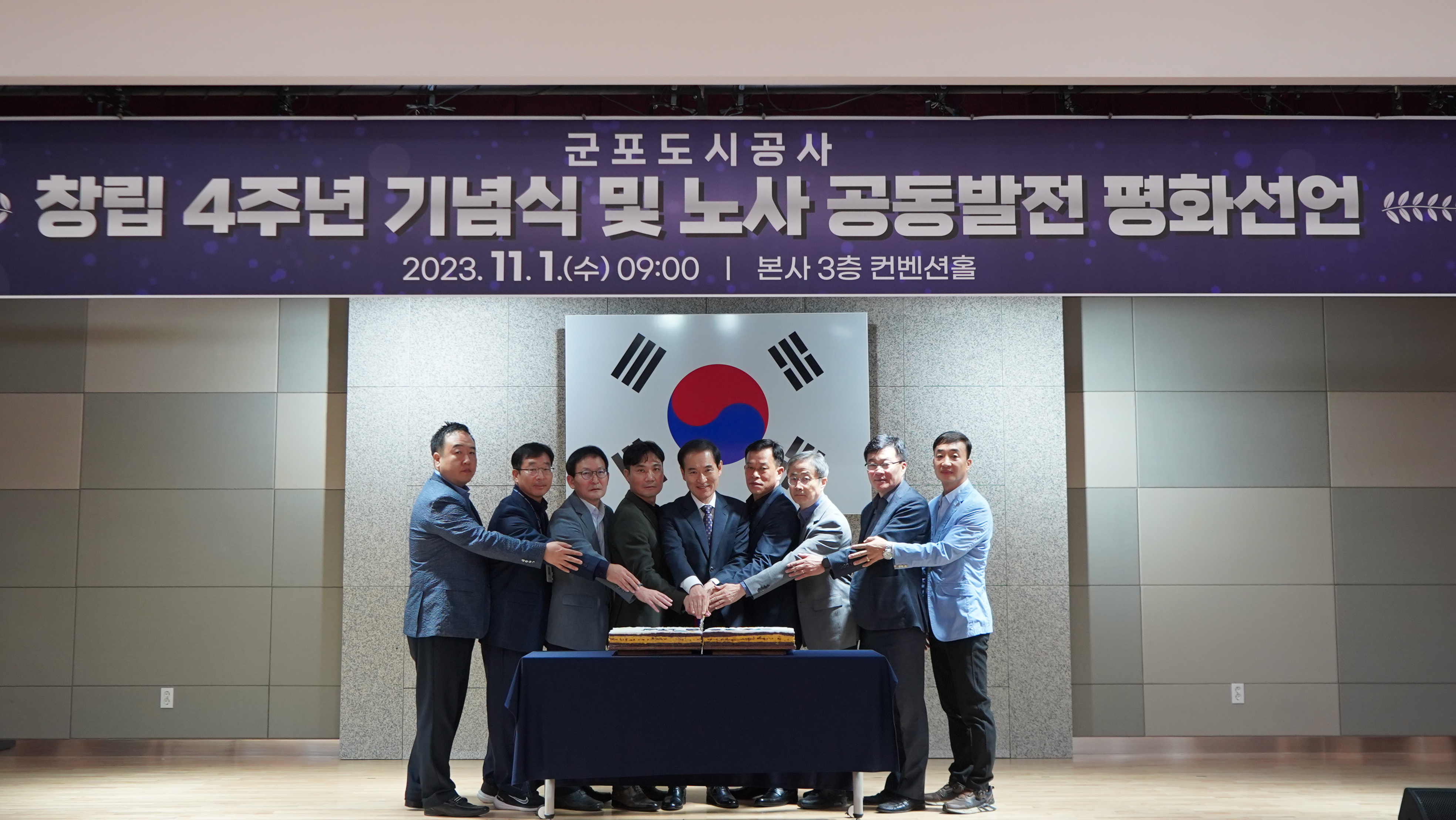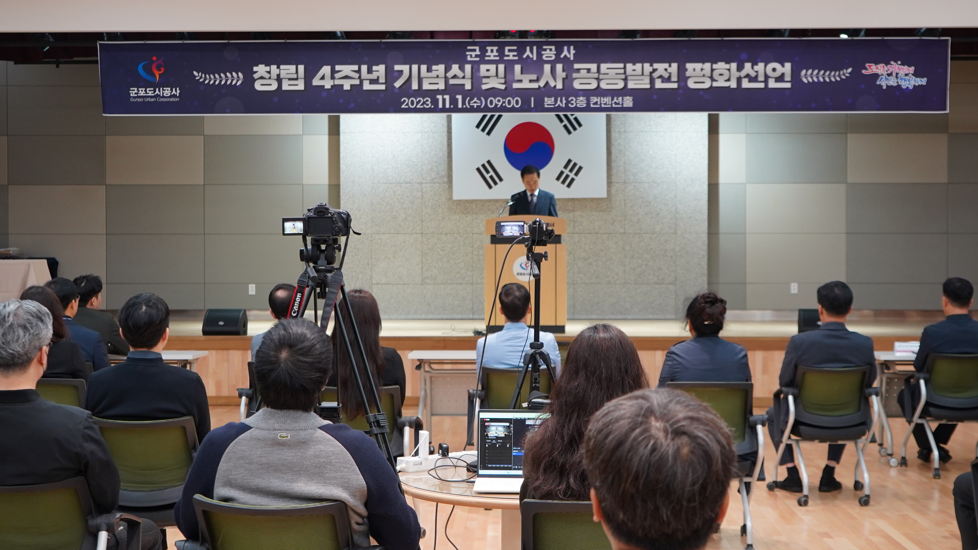 2023-11-02 창립4주년 기념식 및 노사상생 평화 선언식 개최 작성자 CS담당자 등록일자 2023년 11월 28일 10시 32분 33초 조회 296 군포도시공사창립4주년 기념식 및 노사상생 평화 선언식 개최군포도시공사(사장 배재국)는 지난 1일 본사 3층 컨벤션홀에서 공사 임직원이 참석한 가운데 창립 4주년 기념식 및 노사상생 평화 선언식을 진행하였습니다. 기념식은 공사 창립4주년 기념영상 시청, 유공자 표창, 기념사 순으로 진행됐으며 특히 공사는 노사관계 발전과 기업의 안정을 위하여 행사 진행간에 노사상생 평화 선언식을 거행했습니다. 군포도시공사, 창립4주년 기념식 및 노사상생 평화 선언식 개최.jpg [ Size : 90.69KB , Down : 198 ] 미리보기 다운로드 DSC01423.JPG [ Size : 2.94MB , Down : 154 ] 미리보기 다운로드 DSC01440.JPG [ Size : 2.89MB , Down : 154 ] 미리보기 다운로드 DSC01407.JPG [ Size : 2.99MB , Down : 152 ] 미리보기 다운로드 목록보기