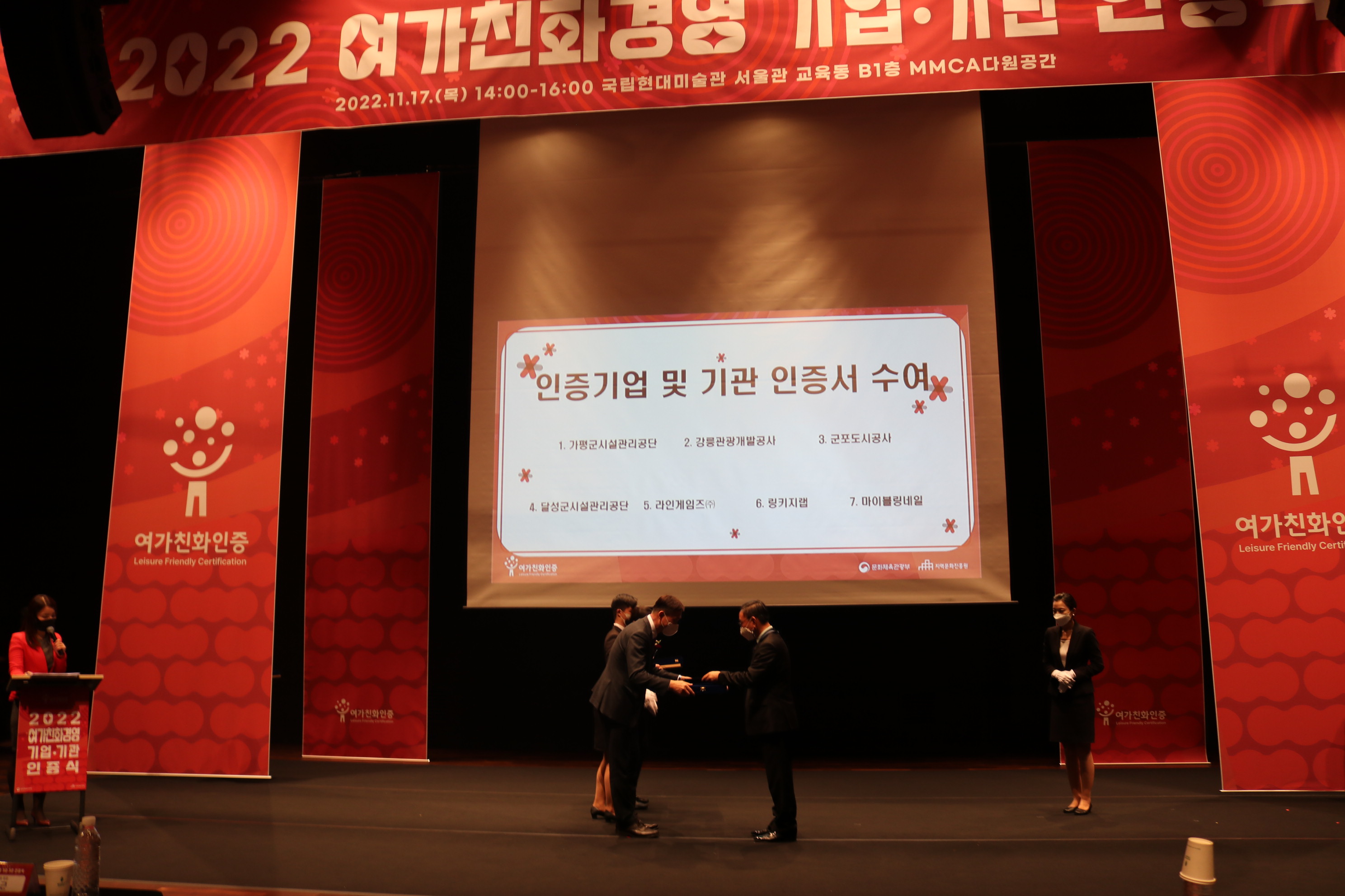 2022-11-17 군포도시공사 '여가친화경영 기업'인증 획득 작성자 CS담당자 등록일자 2022년 11월 21일 10시 33분 46초 조회 339 군포도시공사 '여가친화경영 기업'인증 획득!공사는 지난 11월 17일 문화체육관광부가 주최하고 지역문화진흥원이 주관하는'여가친화경영 기업 인증'을 취득했습니다.직원들의 여가활동 장려를 위해 다양한 정책과 프로그램을 시행하여근로자가 일과 여가생활을 조화롭게 병행할 수 있도록 모범적으로 운영하는 기업으로 선정되었습니다. IMG_5843.JPG [ Size : 710.22KB , Down : 87 ] 미리보기 다운로드 IMG_5847.JPG [ Size : 737.18KB , Down : 93 ] 미리보기 다운로드 목록보기