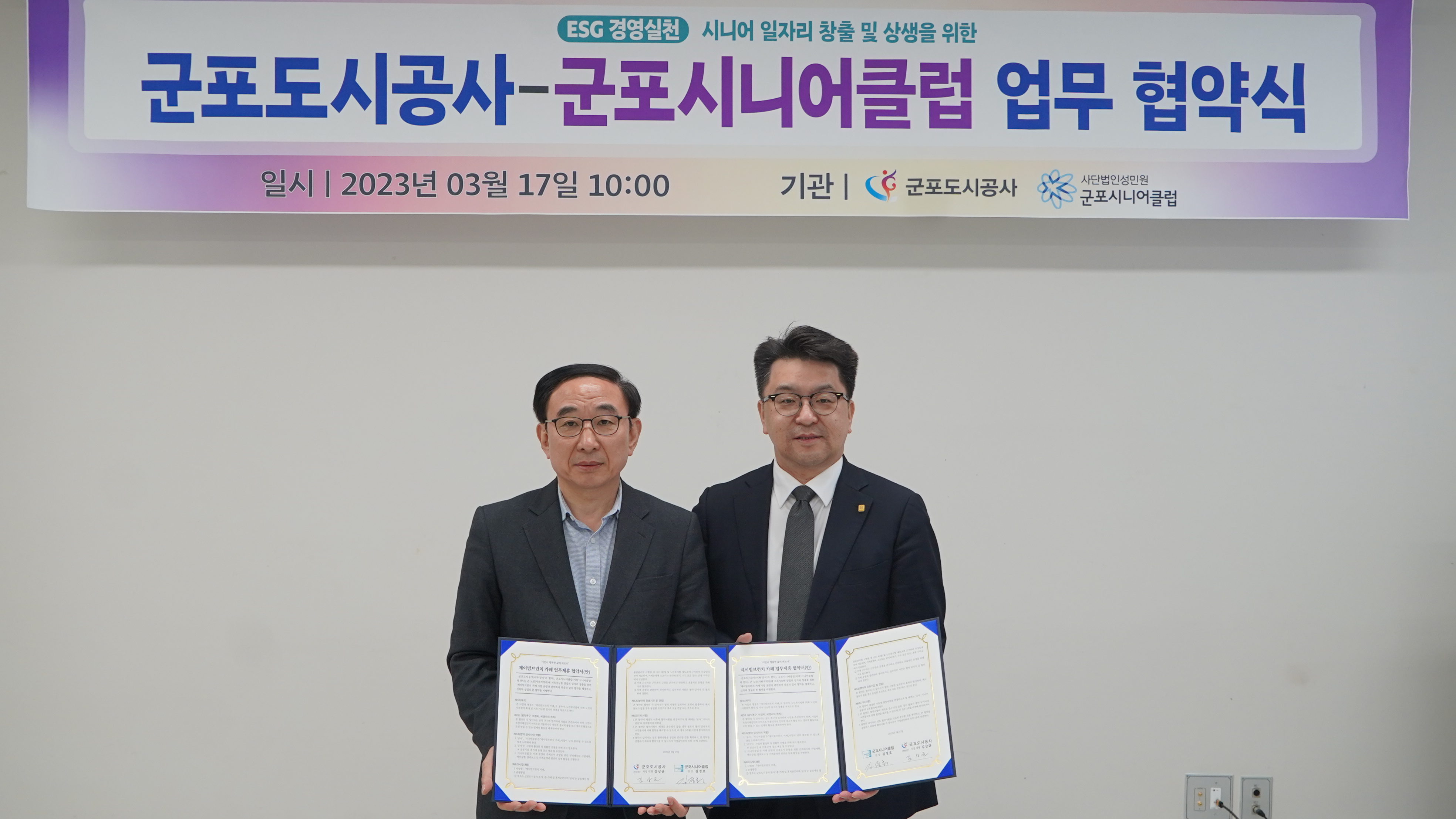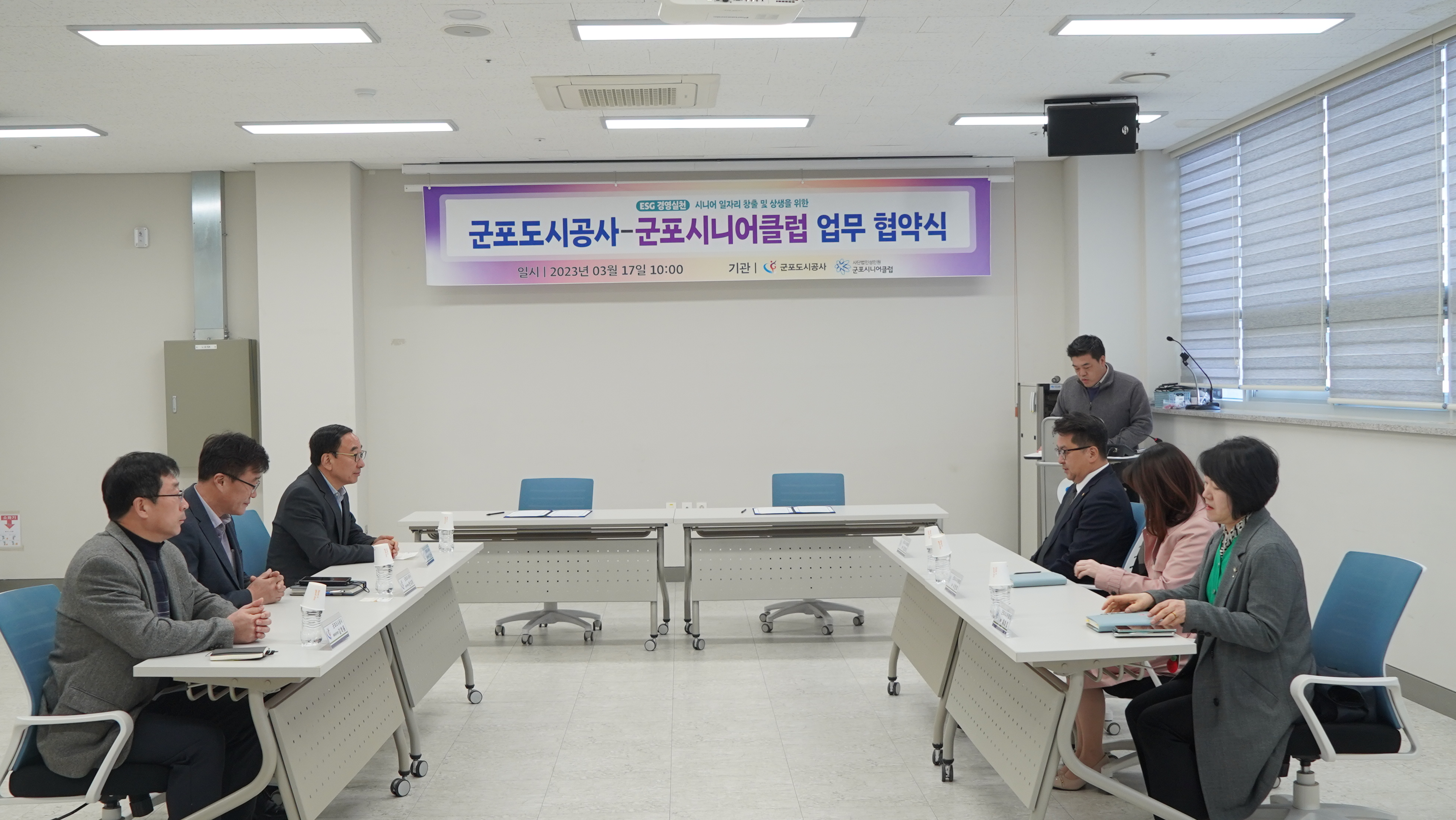 2023-03-17 군포도시공사-군포시니어클럽 업무협약 체결 작성자 CS담당자 등록일자 2023년 3월 30일 10시 45분 25초 조회 357 군포도시공사-군포시니어클럽 업무협약 체결 군포도시공사는 3월 17일 군포시니어클럽과 노인일자리 창출 및 지역상생을 위한 업무협약을 체결하였습니다. 이번 협약으로 군포첨단산업단지에 위치한군포도시공사 본사 1층에 시니어 카페가 운영될 계획이며이를 통해 어르신들의 사회참여가 확대되고아울러 부곡체육시설 이용고객들에게 더 나은 서비스를 제공할 것을 기대하고 있습니다. DSC06445.JPG [ Size : 2.56MB , Down : 156 ] 미리보기 다운로드 DSC06404.JPG [ Size : 2.49MB , Down : 148 ] 미리보기 다운로드 DSC06432.JPG [ Size : 1.84MB , Down : 145 ] 미리보기 다운로드 DSC06434.JPG [ Size : 1.71MB , Down : 147 ] 미리보기 다운로드 DSC06438.JPG [ Size : 1.96MB , Down : 149 ] 미리보기 다운로드 목록보기