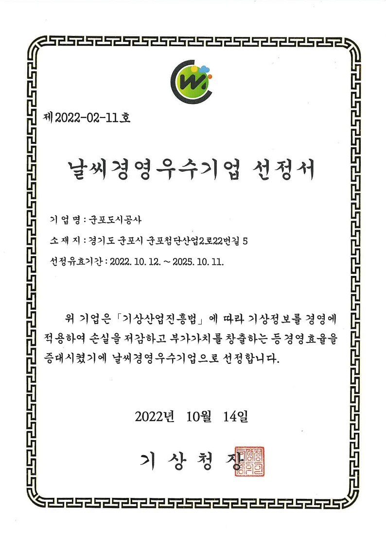 2022-11-17 군포도시공사 기상산업대상 환경부장관상 수상 및 날씨경영 3회연속 인증 취득 작성자 CS담당자 등록일자 2022년 11월 21일 10시 26분 18초 조회 451 군포도시공사 기상산업대상 환경부장관상 수상 및 날씨경영 3회연속 인증 취득!공사는 기상정보를 활용한 시설관리 및 효율성 제고 노력을 인정받아제17회 대한민국 기상산업대상' 기상정보활용 부문에서 환경부장관상을 수상하고안정적인 날씨경영성과를 지속적으로 관리하여 지난 2016년부터 3회 연속 날씨경영 인증을 취득하는 쾌거를 달성했습니다. 사진2.jpg [ Size : 6.93MB , Down : 99 ] 미리보기 다운로드 기상산업대상 환경부장관 표창.jpg [ Size : 180.27KB , Down : 80 ] 미리보기 다운로드 날씨경영 인증.jpg [ Size : 131.97KB , Down : 83 ] 미리보기 다운로드 목록보기