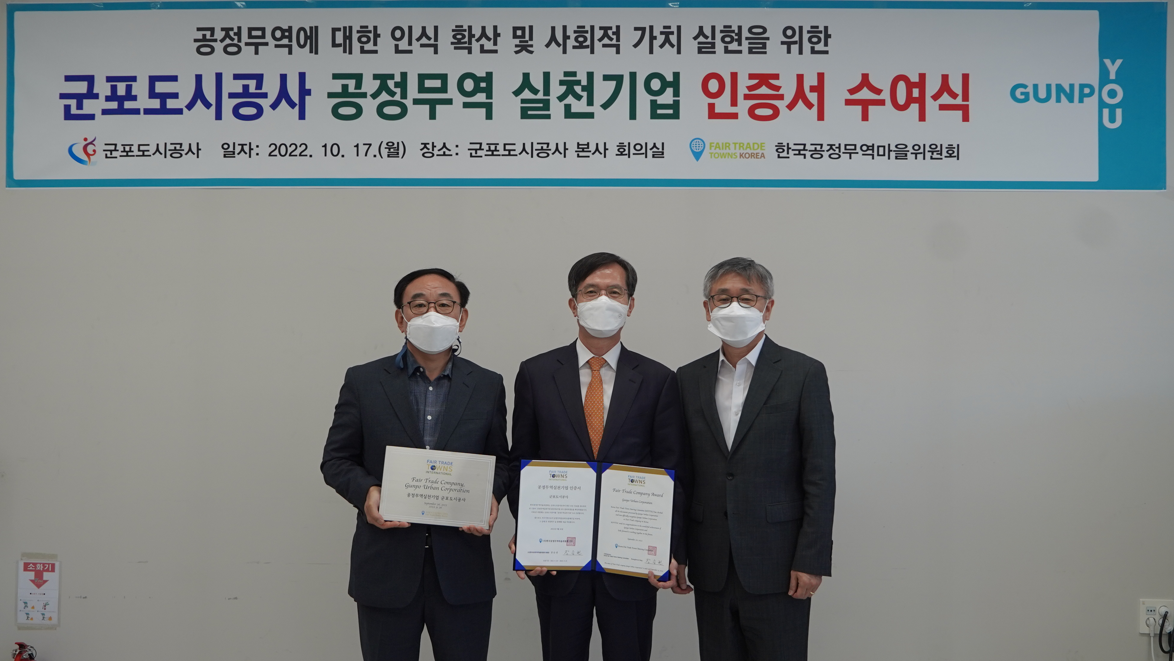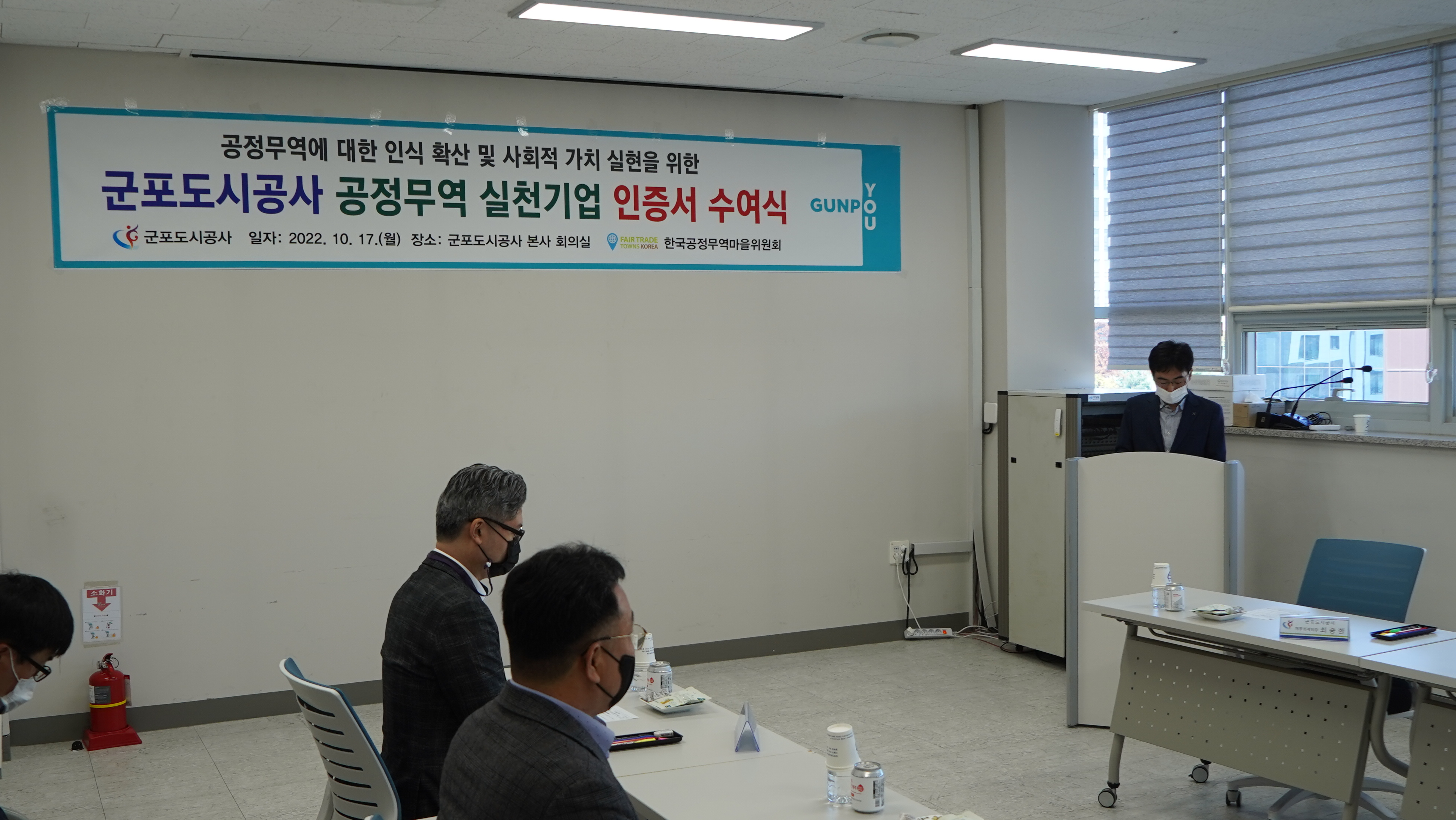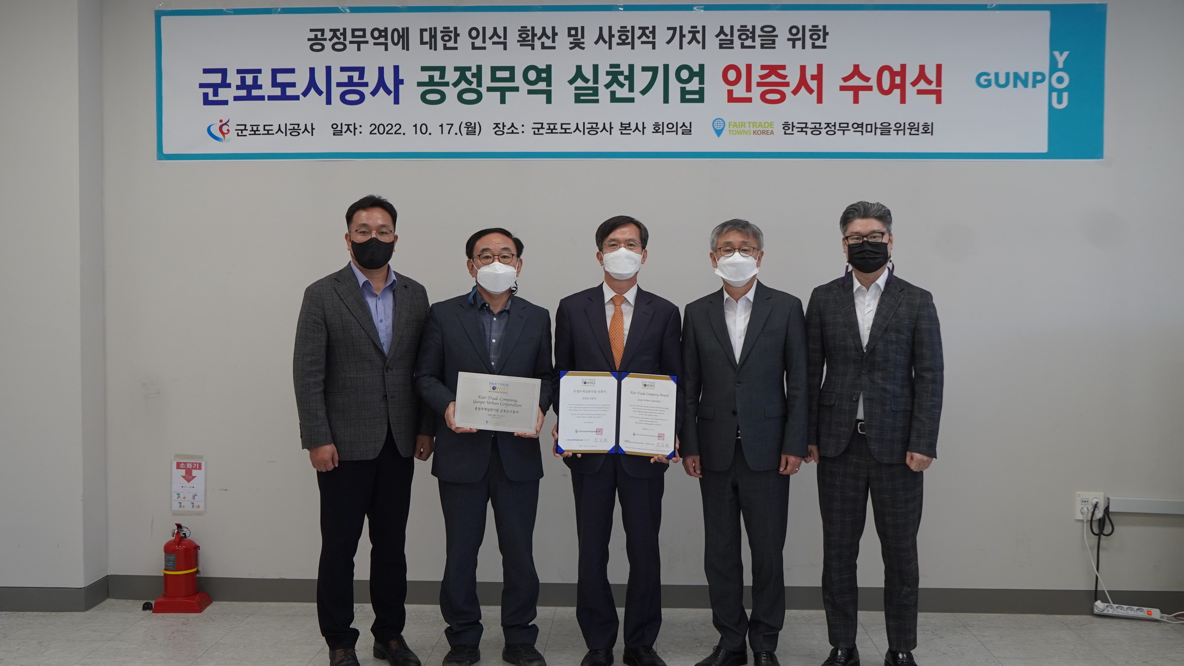 2022-10-17 군포도시공사 공정무역 실천기업 인증 수여식 작성자 CS담당자 등록일자 2022년 10월 18일 13시 45분 19초 조회 371 군포도시공사 '공정무역 실천기업' 인증 취득! 공정무역 촉진을 위해 공정무역제품 사용 및 판매, 교육, 홍보 등공정한 상생 경제문화 조성을 위해 노력하겠습니다!※공정무역이란? - 국제무역에서 공평하고 정의로운 관계를 추구하고 소외된 저개발국가의 생산자와 노동자에게 더 나은 거래조건을 제공하고 그들의 권리를 보호함으로써 지속 가능한 지역사회 발전에 기여하는 거래기반 파트너쉽 DSC03566.JPG [ Size : 2.35MB , Down : 88 ] 미리보기 다운로드 DSC03599.JPG [ Size : 1.73MB , Down : 91 ] 미리보기 다운로드 DSC03615.JPG [ Size : 2.02MB , Down : 93 ] 미리보기 다운로드 DSC03627.JPG [ Size : 2.26MB , Down : 94 ] 미리보기 다운로드 목록보기
