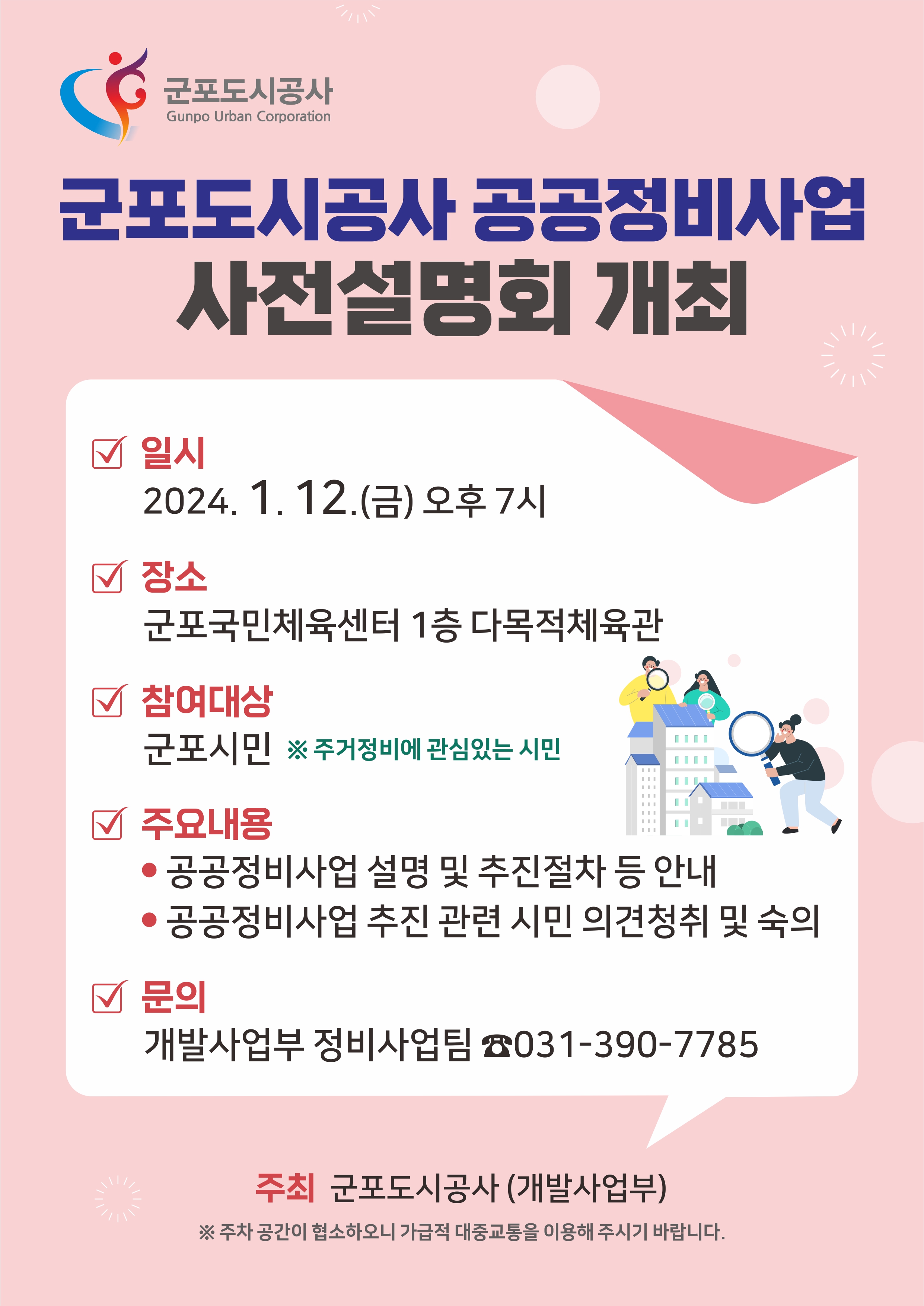 개발사업부 [개발사업부] 군포도시공사 공공정비사업 사전설명회 개최(1/12) 작성자 개발사업부 등록일자 2024년 1월 3일 14시 40분 56초 조회 422 군포도시공사 공공정비사업 사전설명회 안내문.jpg [ Size : 1.14MB , Down : 133 ] 미리보기 다운로드 군포도시공사 공공정비사업 안내문.jpg [ Size : 2.24MB , Down : 128 ] 미리보기 다운로드 목록보기