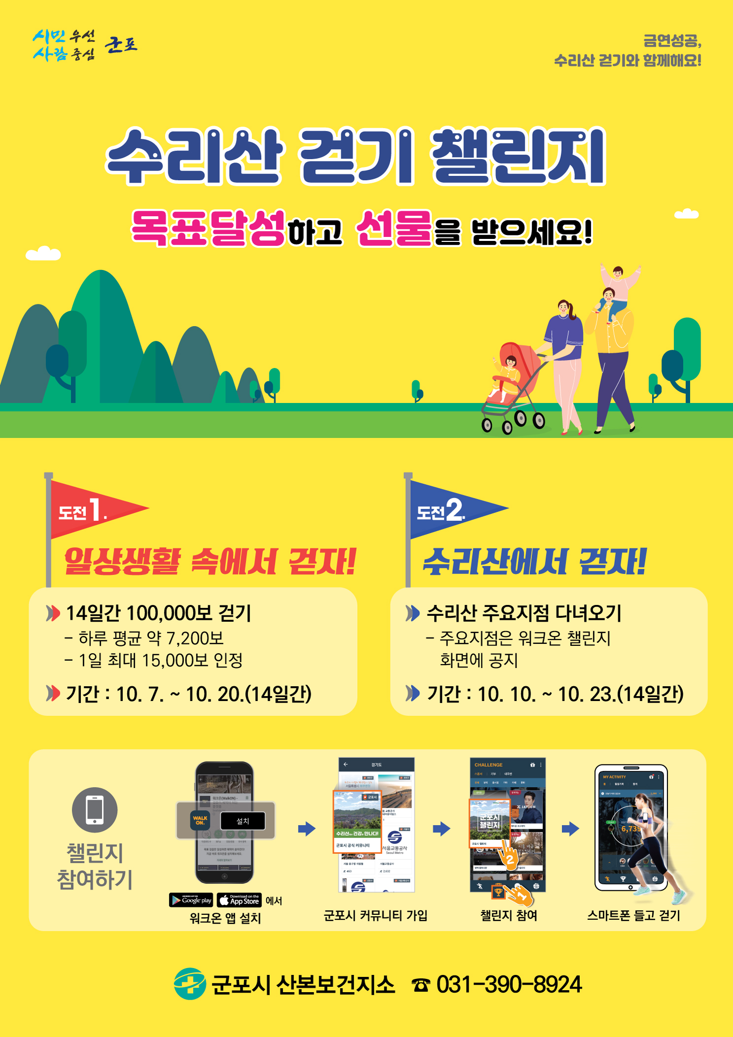 본사 수리산 걷기 챌린지 안내 작성자 등록일자 2019년 10월 4일 10시 32분 49초 조회 725 수리산걷기챌린지-전단지.jpg [ Size : 913.6KB , Down : 207 ] 미리보기 다운로드 목록보기