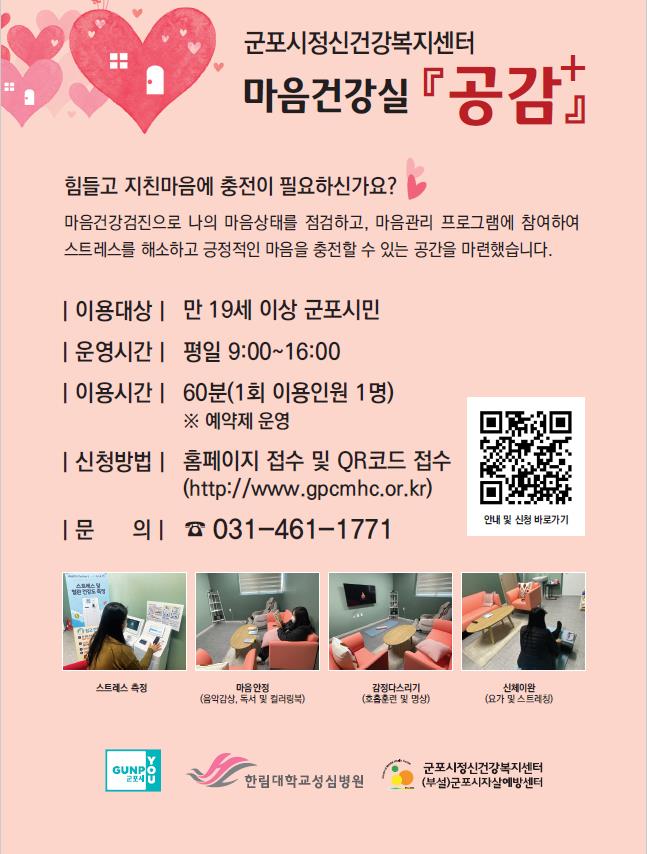 군포시정신건강복지센터에서 마음건강검진으로 마음상태를 점검하고 마음관리프로그램으로 스프레스를 해소하고 긍정적인 마음을 충전할수 있는 마음건강실「공감+」운영하오니 많은 시민들의 참여 부탁드립니다.