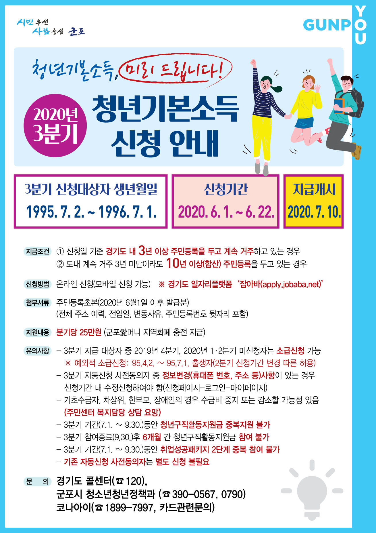 본사 2020년 3분기 청년기본소득 조기지급 안내 작성자 군포도시공사 등록일자 2020년 5월 27일 14시 7분 59초 조회 762 청년의 복지향상과 기본권 보장을 위한「2020년 3분기 청년기본소득」이 코로나19 확산으로 어려움을 겪고 있는 청년을 지원하고자 일정 변경하여 조기지급됩니다. 자세한 내용은 첨부파일을 참고하시기 바랍니다. 3분기청년기본소득(홍보물-최종본).jpg [ Size : 423.54KB , Down : 272 ] 미리보기 다운로드 목록보기