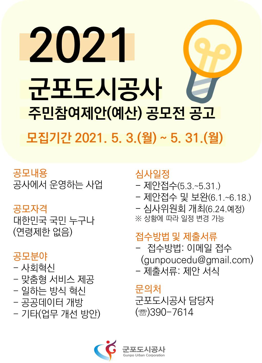 주민의 창의적인 의견과 고안을 장려 계발하고 공사 경영에 적극 반영하여 효율적으로 공사를 운영하고자 다음과 같이 제안을 공모합니다.