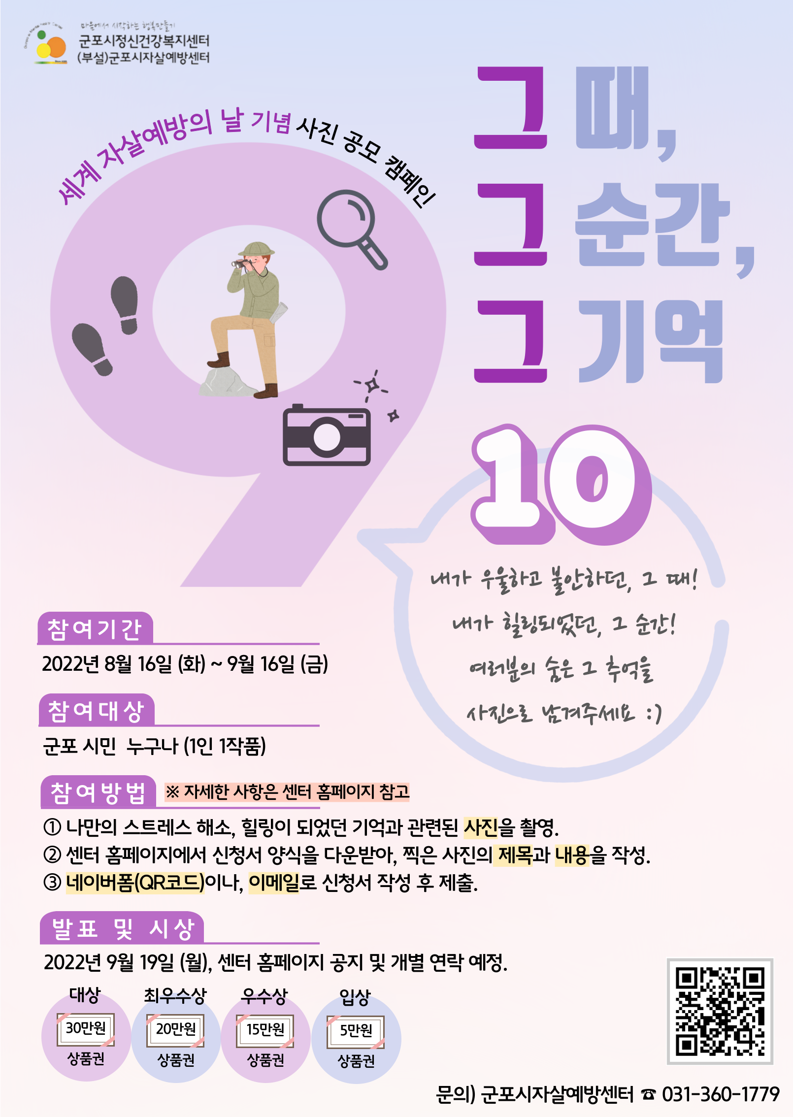 군포시정신건강복지센터에서 2022년 세계 자살예방의 날을 맞이하여, 나만의 스트레스 해소 방법, 힐링 경험과 기억들이 담긴 사진을 공유하는 「그 때, 그 순간, 그 기억」캠페인을 진행하고자 하오니, 많은 시민들의 참여 부탁드립니다.