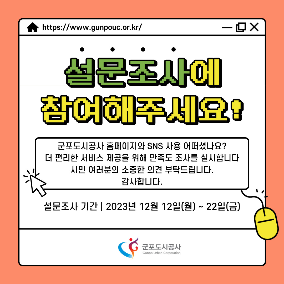 군포도시공사는 시민중심의 온라인서비스를 지속적으로 확대 발전시키기 위하여 군포도시공사 홈페이지와 SNS의 이용현황 및 개선사항에 대하여 시민 여러분들의 의견을 듣고 싶습니다.