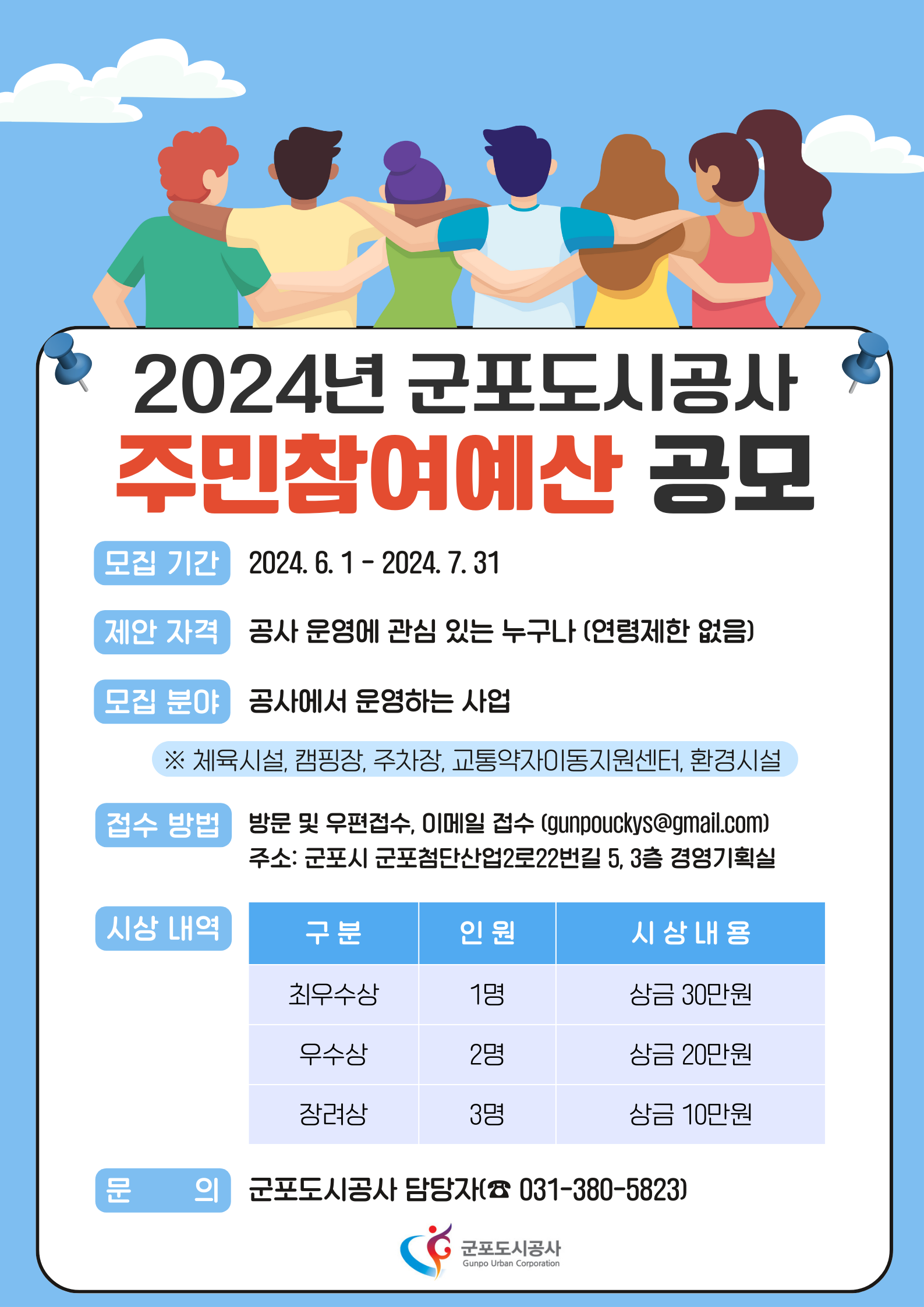 본사 2024년 군포도시공사 주민참여예산 공모전 공고 작성자 예산담당자 등록일자 2024년 5월 31일 16시 21분 53초 조회 770 공고번호 제2024-062호 2024년 군포도시공사 주민참여예산 공모전 공고 주민의 창의적인 의견과 고안을 장려 계발하고 공사 경영에 적극 반영하여 효율적으로 공사를 운영하고자 다음과 같이 주민참여예산을 공모합니다. 2024. 6. 1.군포도시공사사장※ 자세한 내용은 첨부파일을 참고하시기 바랍니다. 2024년 군포도시공사 주민참여예산 공모전 공고.hwp [ Size : 75KB , Down : 455 ] 다운로드 2024년 주민참여예산 제안서 및 설명서(양식).hwp [ Size : 71KB , Down : 438 ] 다운로드 2024년 군포도시공사 주민참여예산 공모 (4).png [ Size : 356.56KB , Down : 222 ] 미리보기 다운로드 목록보기