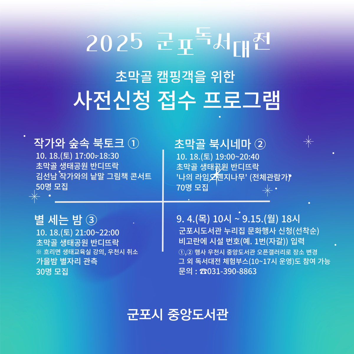 본사 2025년 군포독서대전 초막골 캠핑객을 위한 사전시청 접수 프로그램 작성자 군포도시공사 등록일자 2025년 8월 29일 13시 4분 6초 조회 260 사전접수홍보문(웹용).jpg [ Size : 334.62KB , Down : 285 ] 미리보기 다운로드 목록보기