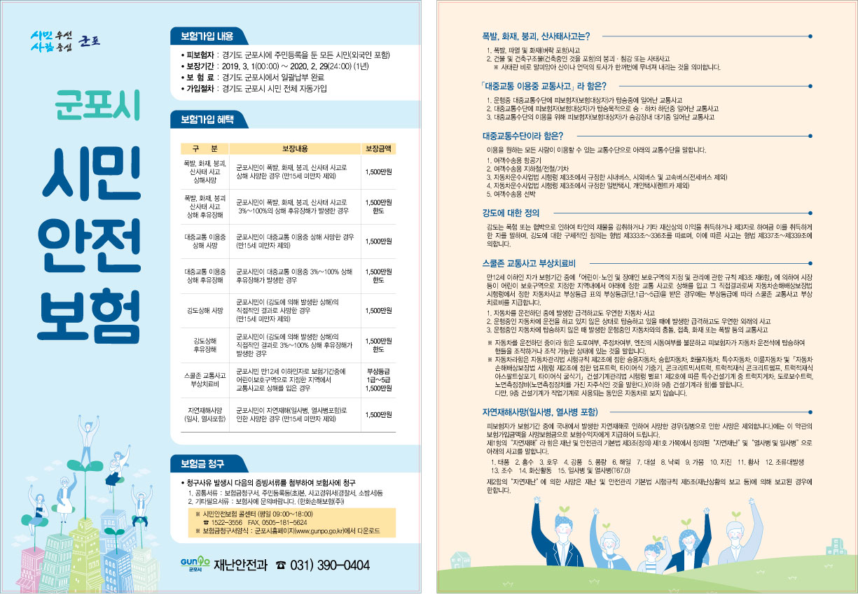 본사 군포시 시민안전보험 실시 안내 작성자 등록일자 2019년 3월 19일 17시 38분 14초 조회 805 이미지가 작아 잘 안보이시면 첨부파일의 포스터를 열어보시기 바랍니다. 시민안전보험 홍보전단.jpg [ Size : 243.22KB , Down : 237 ] 미리보기 다운로드 목록보기