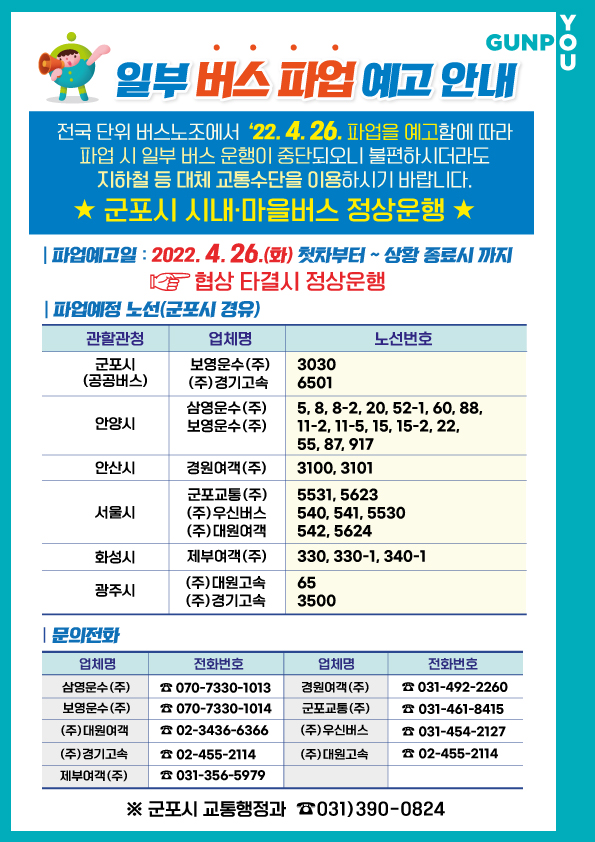 전국 단위 버스노조에서 2022. 4. 26.(화) 첫차부터 전면 총파업을 예고함에 따라 파업에 따른 시민 불편사항이 발생하지 않도록 파업예고에 따른 대체수단 이용 안내를 적극 홍보하여 주시기 바랍니다.