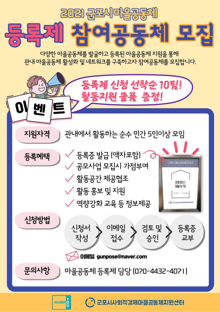 군포시 사회적경제 - 마을공동체 지원센터에서 관내 다양한 마을공동체 주체발굴, 마을공동체 활성화 및 네트워크 구축을 위한 「마을공동체 등록제」참여 이벤트를 다음과 같이 진행하고자 하오니 많은 시민들의 참여 부탁드립니다.