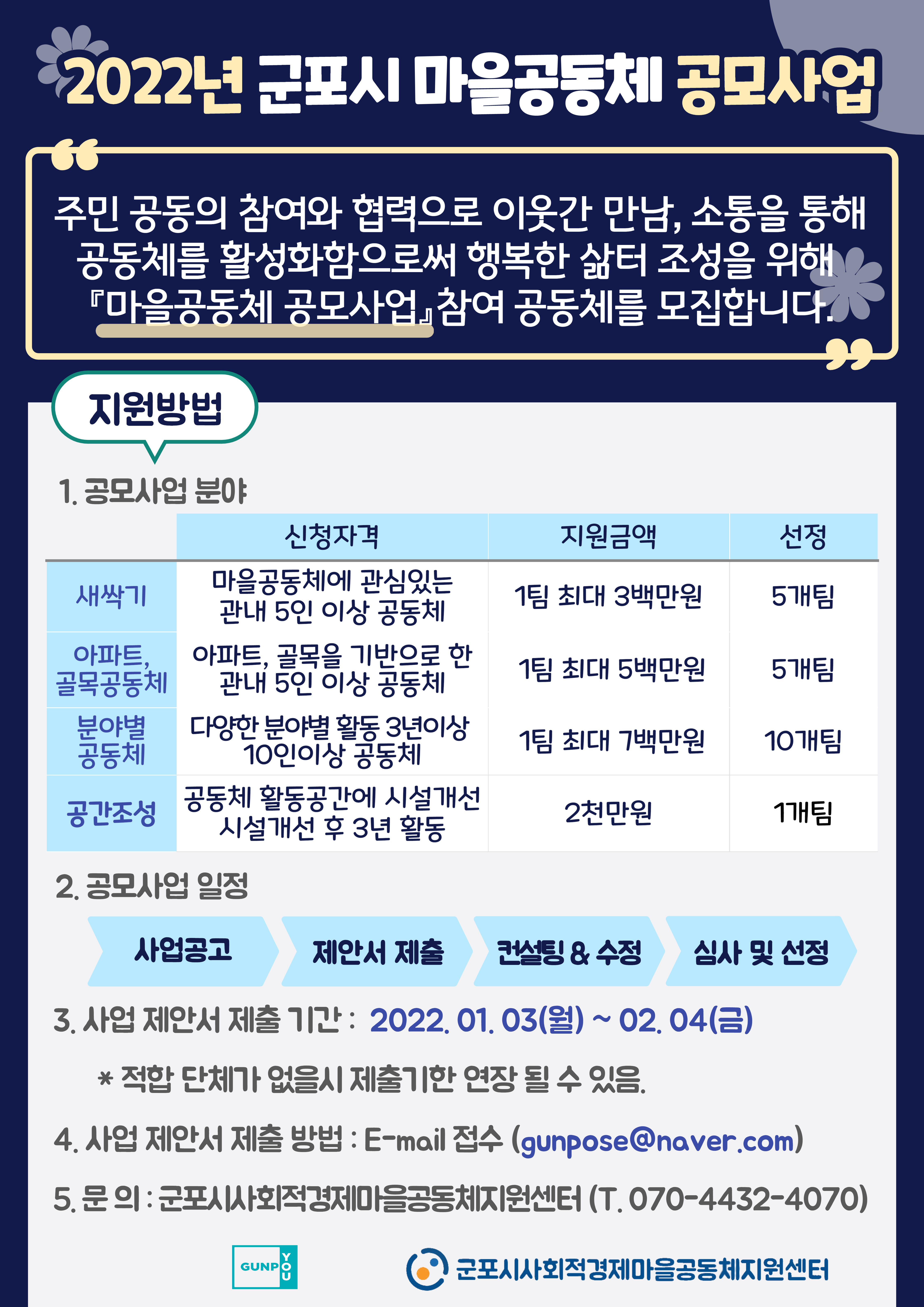2. 군포시 사회적경제 마을공동체지원센터에서 「2022년 군포시 마을공동체 주민제안 공모사업」을 다음과 같이 진행하오니 많은 시민들의 참여부탁드립니다.