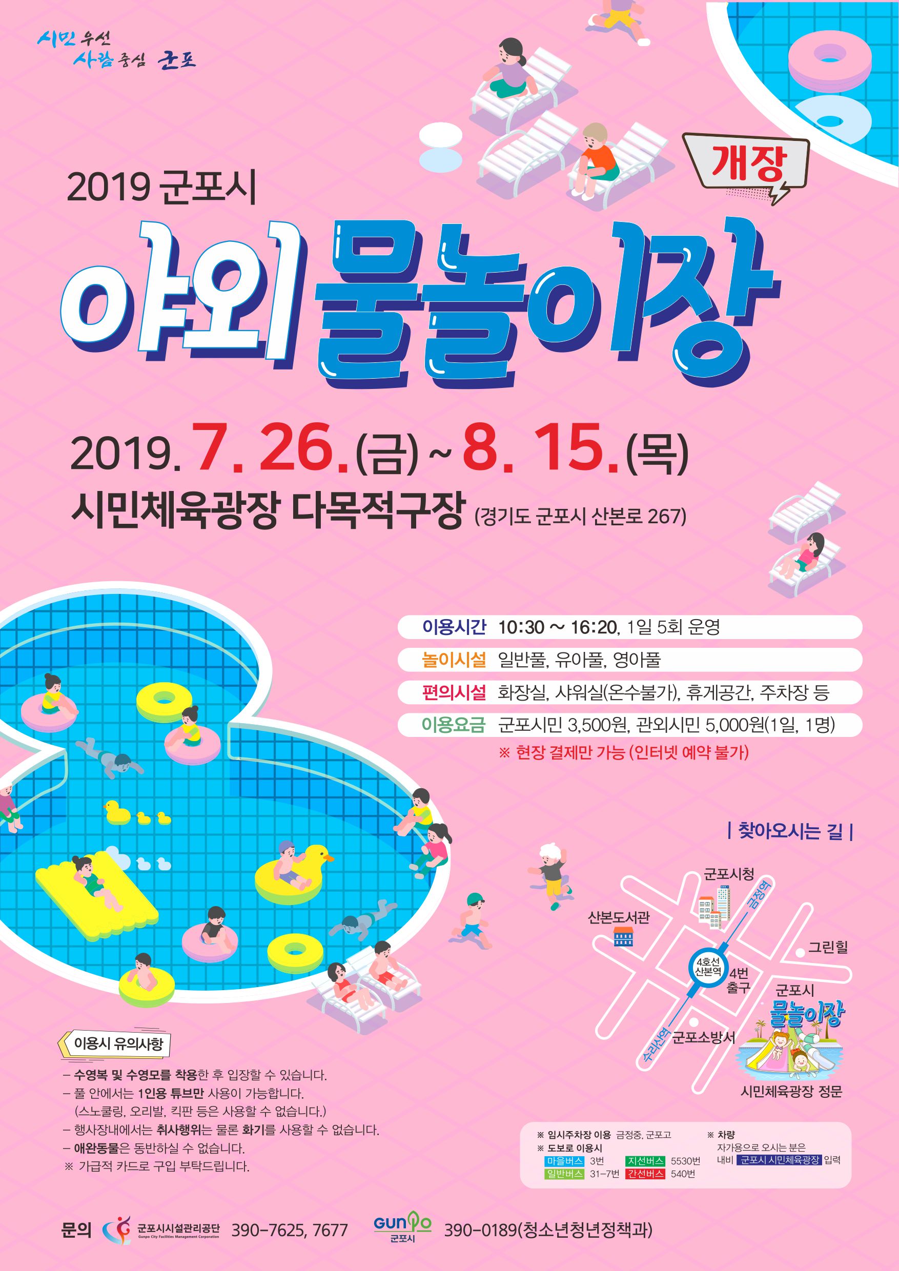 체육레저부 [시민체육광장]야외 물놀이장 운영(단체이용접수) 안내 작성자 등록일자 2019년 7월 24일 16시 44분 34초 조회 836 ※ 단체이용 접수 시 첨부된 파일(야외 물놀이장 이용 신청서)작성하여 이메일 혹은 팩스 접수 바랍니다. 야외 물놀이장 안내문.jpg [ Size : 491.77KB , Down : 193 ] 미리보기 다운로드 야외 물놀이장 이용 신청서.hwpx [ Size : 56.06KB , Down : 172 ] 다운로드 목록보기