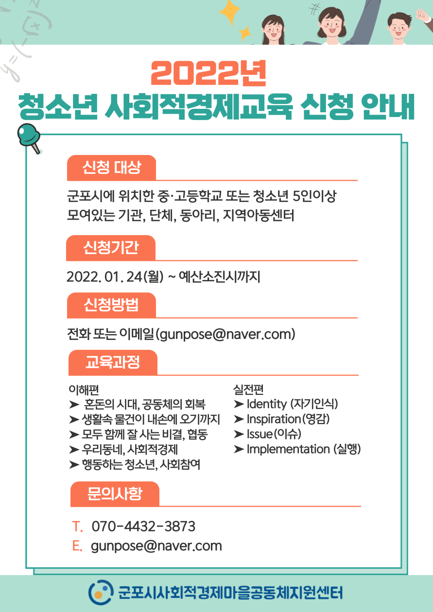군포시사회적경제마을공동체지원센터-2022-117(2022.02.04.)호와 관련, 군포시 사회적경제·마을공동체지원센터에서 관내 청소년들에게 사회적경제에 대한 긍정적 인식확산과 진로확장에 기여하기 위해 청소년 사회적경제 교육을 다음과 같이 진행하고자 하오니 시민들의 많은 참여 부탁드립니다.