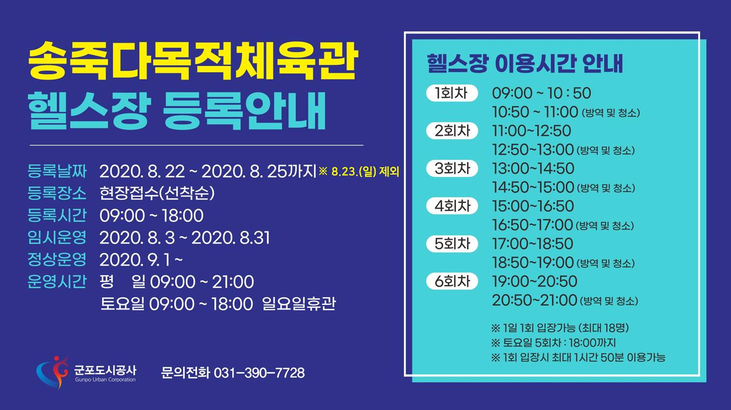 ※ 현재 군포시 실내·외 체육시설 휴관중(~8.29.)으로 정상운영 일정은 변경될 수 있습니다.