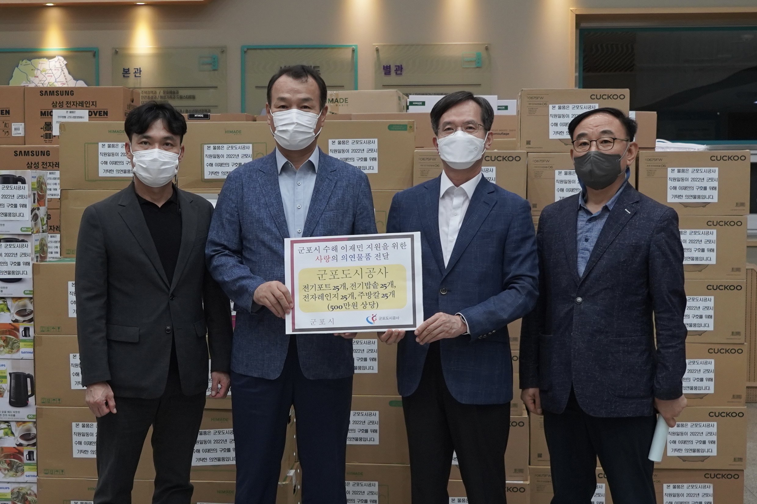 군포도시공사(사장 원명희)가 심각한 수해 피해를 겪은 지역주민들에게 500만원 상당의 생활필수가전을 노조위원장(이한상)과 함께 노사합동으로 13일 군포시를 통해 전달했다.