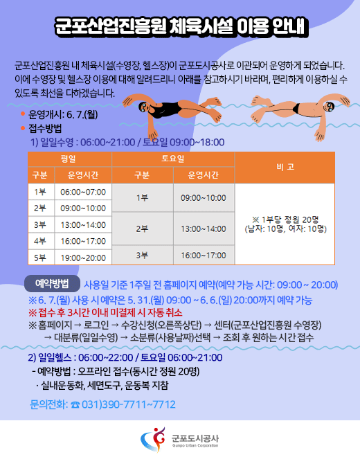 군포도시공사(사장 원명희)는 군포산업진흥원 내 체육시설(군포시 군포첨단산업2로22번길 5 B1층)을 이관받아 6월 7일부터 본격 운영을 개시했다고 밝혔다.