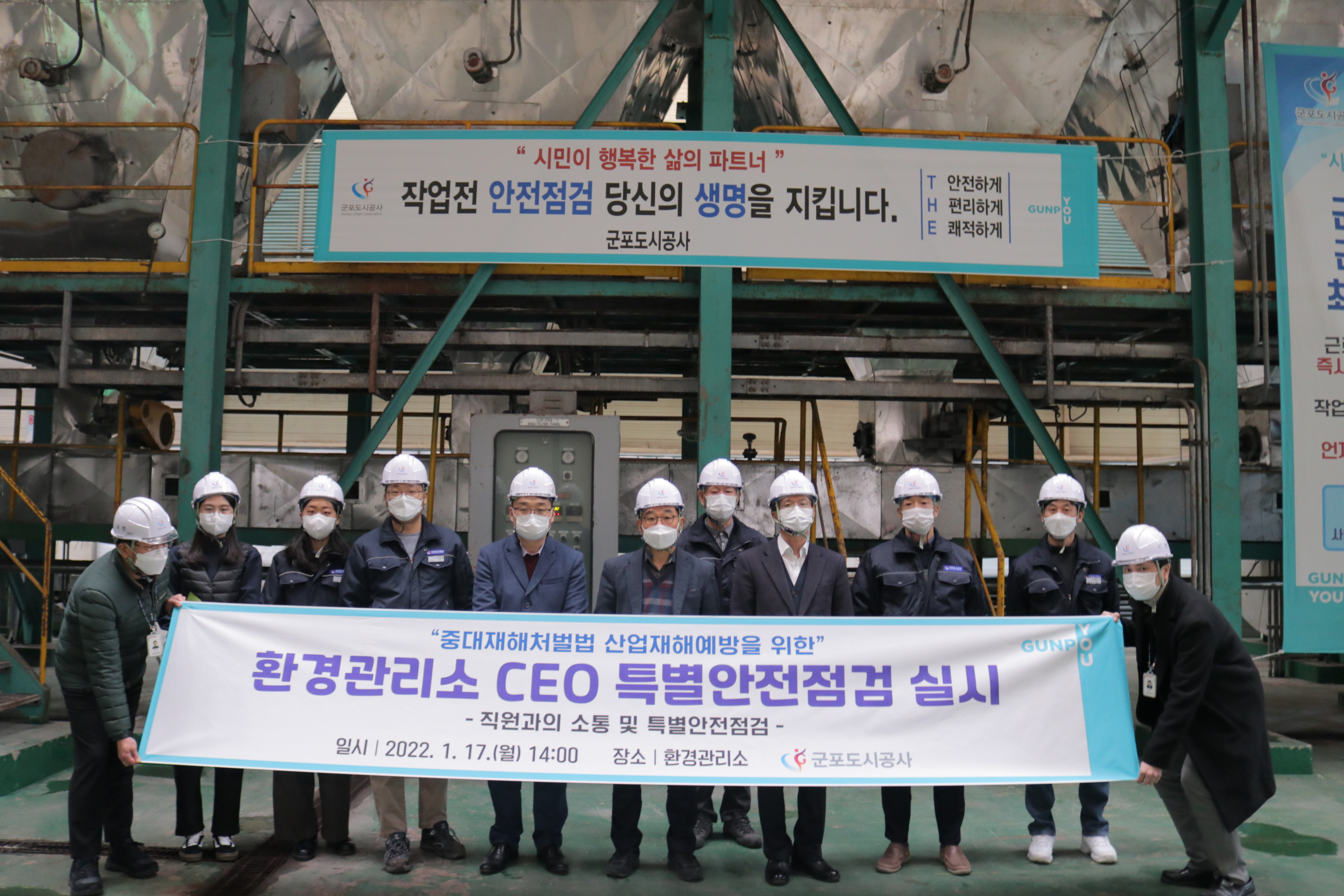 군포도시공사(사장 원명희)는 오는 27일부터 중대재해처벌법이 시행됨에 따라 군포환경관리소에서 ‘CEO 주관 특별 안전점검’ 을 실시했다고 밝혔다.