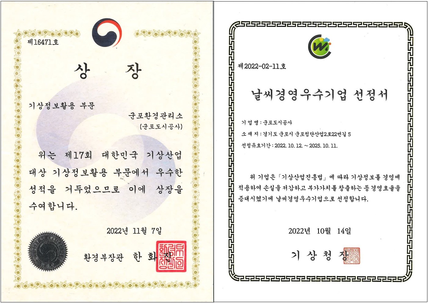 군포도시공사, 기상산업대상 환경부장관상 수상 및 날씨경영 3회연속 인증 취득