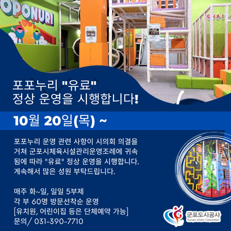□ 군포도시공사 산하 군포국민체육센터 2층에 위치한 유·아동 놀이체육시설 ‘포포누리’가 5개월여간의 시범운영을 마치고 20일(목)부터 정식 유료개장하였다.