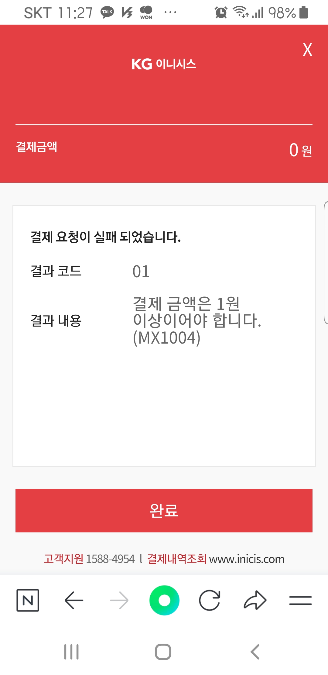 안녕하세요. 수강 및 대관 결재를 모바일로 접속하여 결재를 진행하면 결재가 되지 않습니다, 지난 번에도 동일한 문제가 발생하여 취소하고 재 신청해서 해보았으나, 결재 진행이 안되어 PC 인터넷으로 신청을 진행했습니다. 결론적으로 결재가 PC환경에서는 진행이 잘되나 모바일 환경에서는 "결재 금액이 1원이상이어야 합니다." 메시지와 함께 결재 진행이 불가하니 원인분석 해결 부탁합니다. 오류 캡쳐 파일 첨부합니다. 감사합니다.