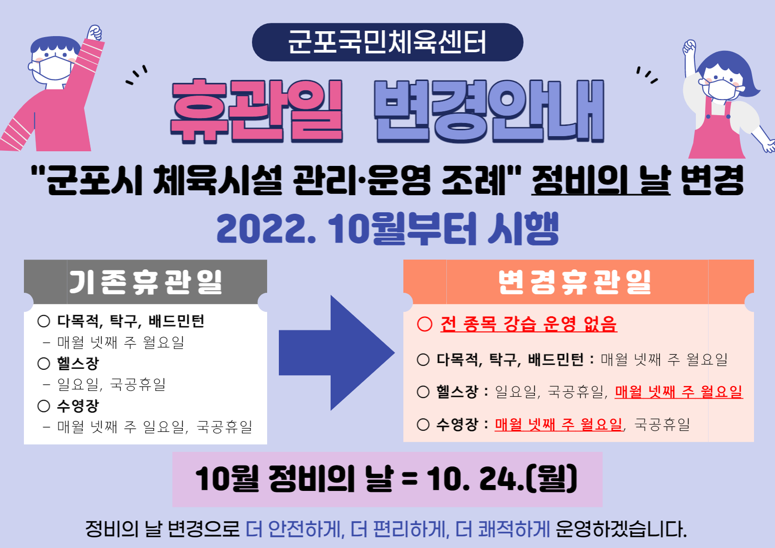 체육레저부 [군포국민체육센터] 휴관일 변경안내 작성자 국민체육센터 등록일자 2022년 10월 6일 10시 7분 10초 조회 786 군포국민체육센터 정비의 날 변경 안내.jpg [ Size : 647.61KB , Down : 748 ] 미리보기 다운로드 목록보기