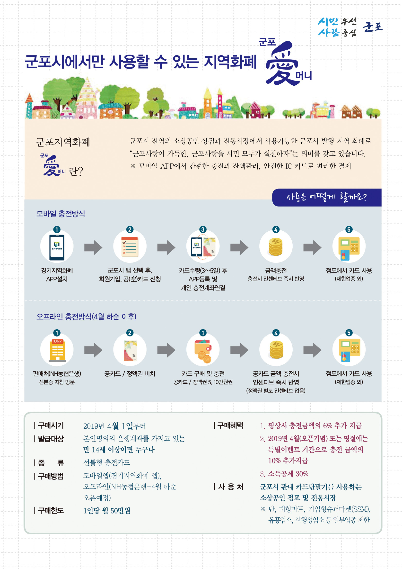 본사 군포지역화폐 『군포愛머니』 개시 알림 작성자 등록일자 2019년 4월 1일 10시 41분 47초 조회 897 군포 지역화폐 군포애머니(전단지).jpg [ Size : 621.16KB , Down : 206 ] 미리보기 다운로드 목록보기