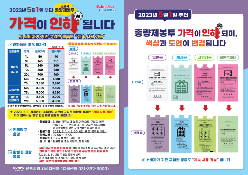 환경자원부 종량제봉투 가격 인하 안내 작성자 군포도시공사 등록일자 2023년 4월 14일 11시 20분 19초 조회 1,137 2023년 5월 1일부터 종량제봉투 가격이 인하됨을 알려드립니다.자세한 내용은 첨부파일을 참고하시기 바랍니다. 감사합니다. 종량제봉투 가격인하 안내문.png [ Size : 582.28KB , Down : 1,168 ] 미리보기 다운로드 목록보기