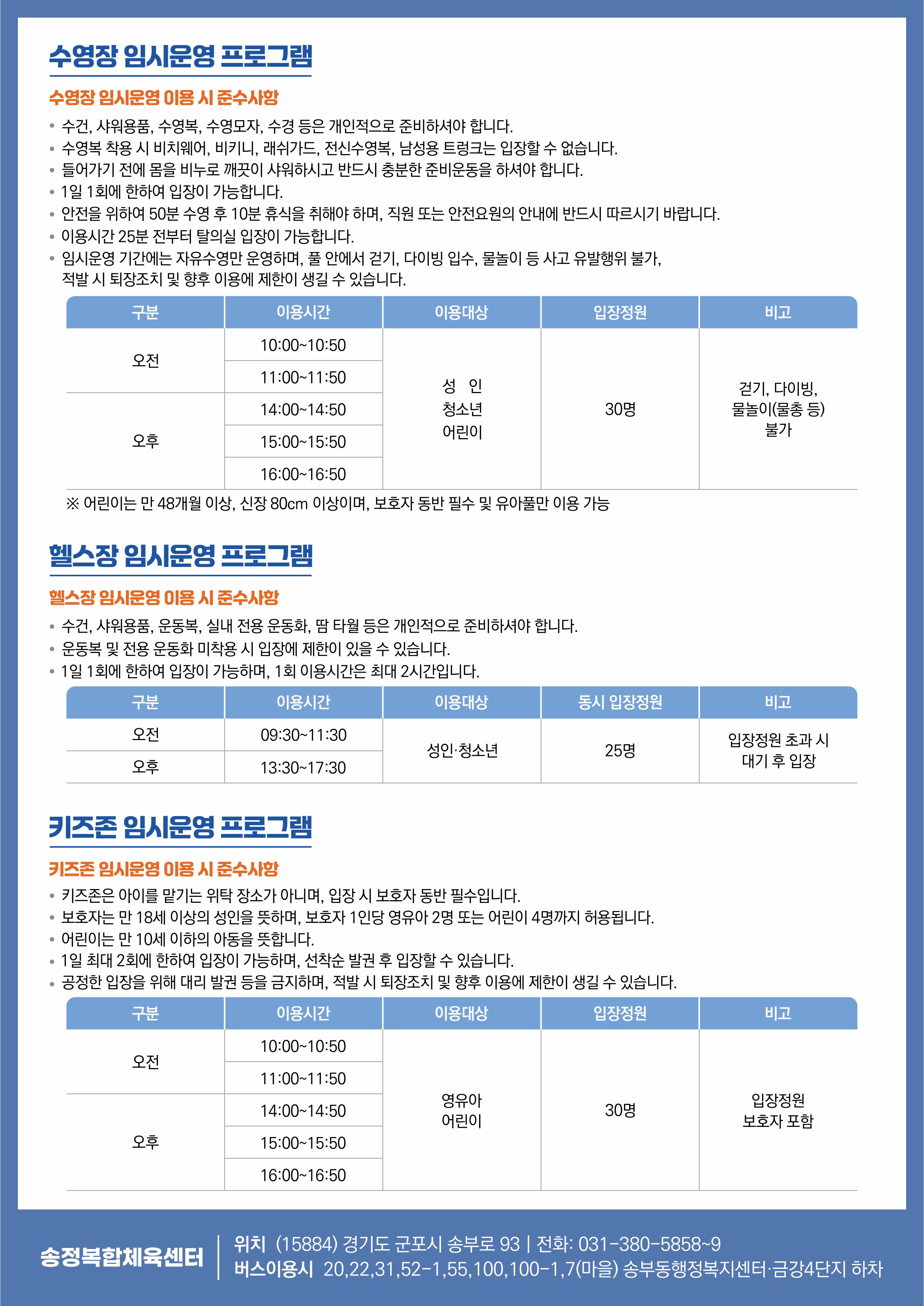 운영시설: 수영장(자유수영), 헬스장(일일헬스), 키즈존(일일이용)