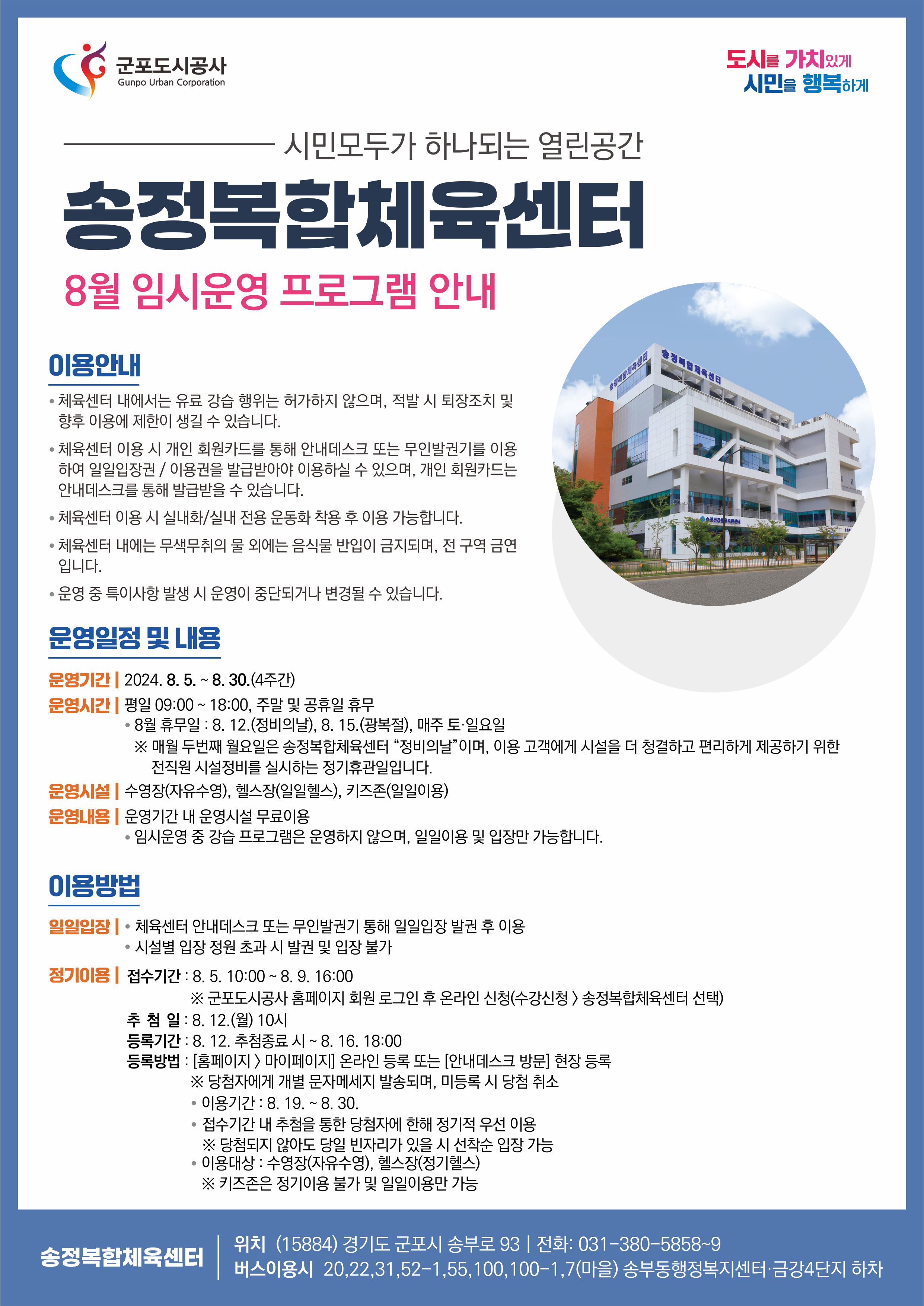 ※ 군포도시공사 홈페이지 회원 로그인 후 온라인 신청(수강신청 > 송정복합체육센터 선택)