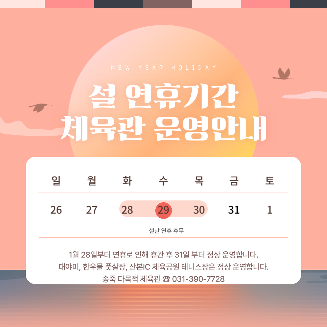 스포츠레저부 [송죽다목적체육관] 2025년 1월 정비의 날 및 설 연휴 휴관 안내(1/28~30) 작성자 소규모체육시설팀 등록일자 2025년 1월 6일 10시 44분 56초 조회 280 송죽다목적체육관 "1월 정비의 날" 안내- 정비의 날: 1월 20일(월)- 내 용: 송죽다목적체육관 시설 정비(휴관) - 문 의: 031-390-7728(대관실) 2025년 송죽다목적체육관 설 연휴 휴관안내.png [ Size : 360.04KB , Down : 240 ] 미리보기 다운로드 목록보기