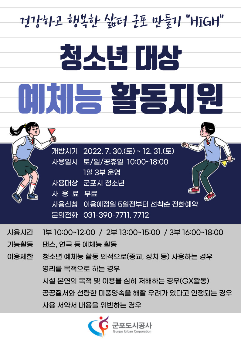 체육레저부 [군포국민체육센터] 청소년 대상 예체능 활동지원 작성자 국민체육센터 등록일자 2022년 7월 25일 15시 19분 21초 조회 429 청소년-예체능-활동지원-001.jpg [ Size : 202.23KB , Down : 232 ] 미리보기 다운로드 목록보기