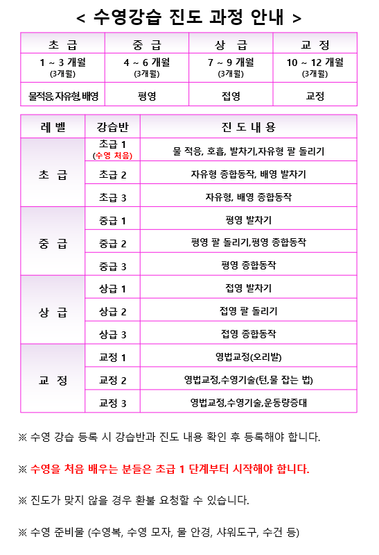 - 강습 신청 및 등록 후 반 변경 불가(예: 수영 중급반 신청 후 초급반 변경 불가)