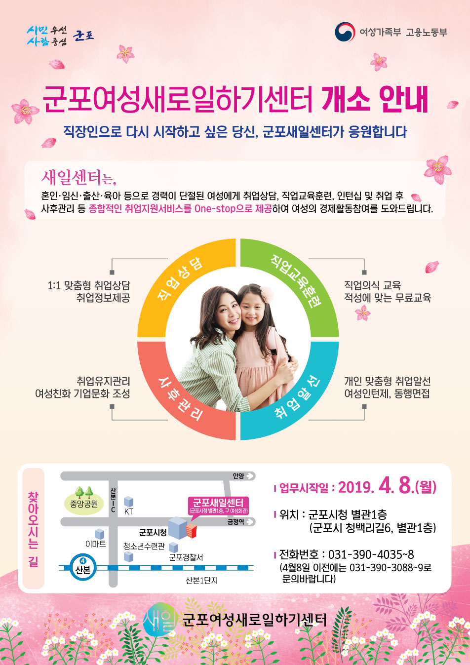 본사 군포여성새로일하기센터 개소 안내 작성자 등록일자 2019년 3월 21일 16시 27분 12초 조회 1,095 이미지가 작아 잘 안보이실 경우 첨부파일을 다운로드 받아 열어서 크게 보실 수 있으니 참고 바랍니다. 새일센터 개소 홍보문.jpg [ Size : 257.16KB , Down : 181 ] 미리보기 다운로드 목록보기