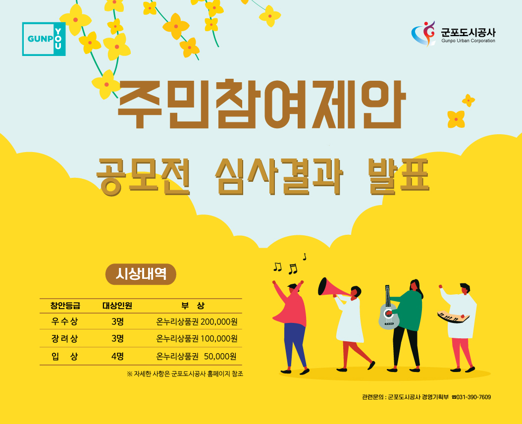 군포도시공사(사장 원명희)는 주민의 창의적인 의견과 고안을 장려·계발하고자 5월 1일부터 5월 31일까지 1달간 모집했던 ‘군포도시공사 주민참여제안 공모전’의 심사 결과를 지난 14일 발표했다.