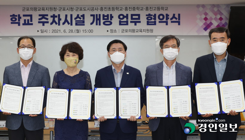 군포시와 군포도시공사, 군포의왕교육지원청, 흥진초·중·고교는 28일 교육지원청 백운홀에서 학교 주차시설 개방에 관한 업무 협약을 체결했다.